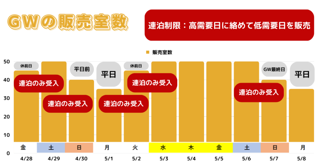 高需要日はかなり早い段階で予約されているのですから、高需要日の前後を連泊プランにして、GWの販売プランを連泊に制限するのはどうでしょう。